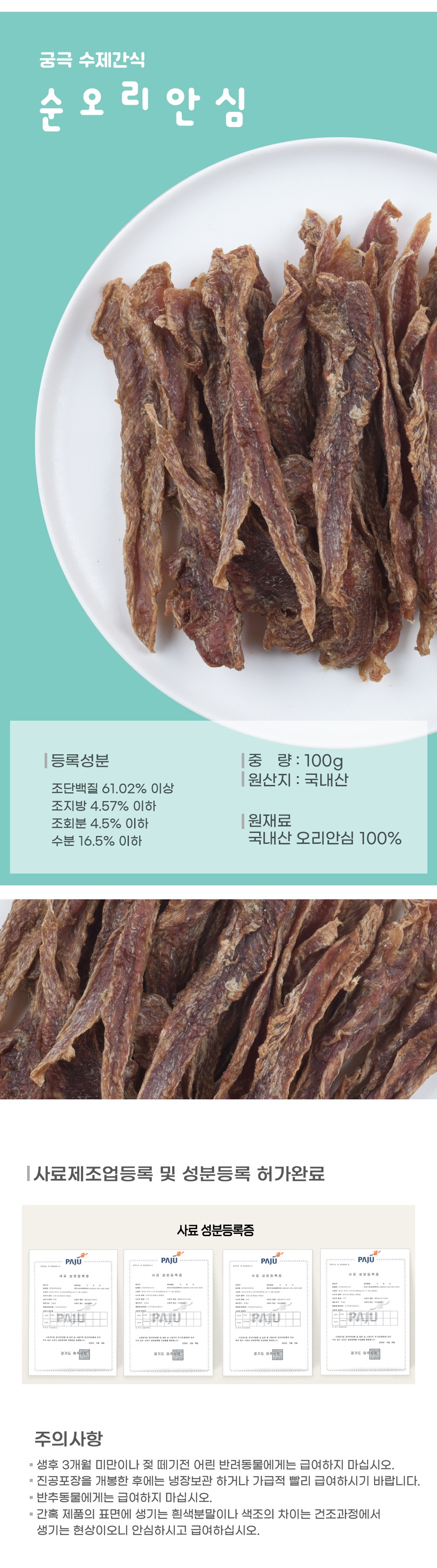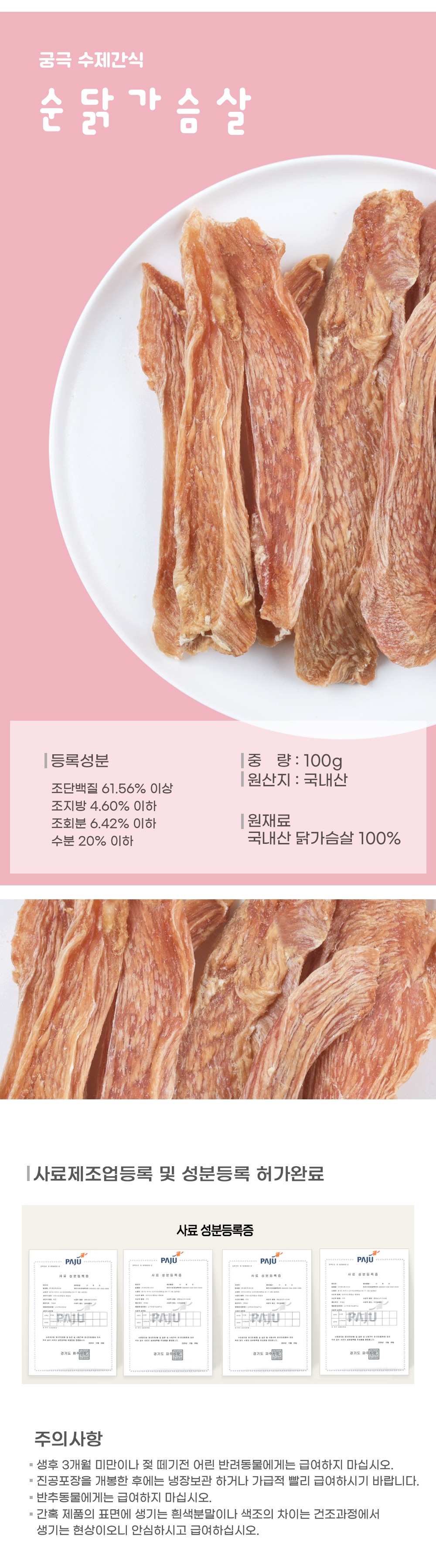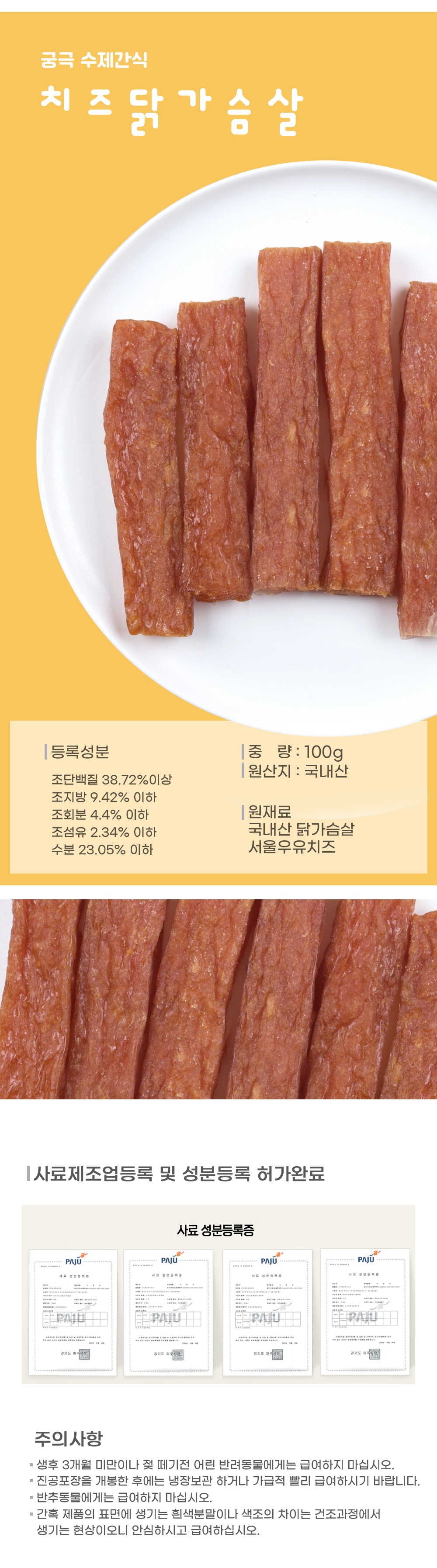 해썹 설비 기준을 갖춘 인증시설에서 신선하고 위생적으로 제조하여 더욱 안심하고 급여하실 수 있습니다.