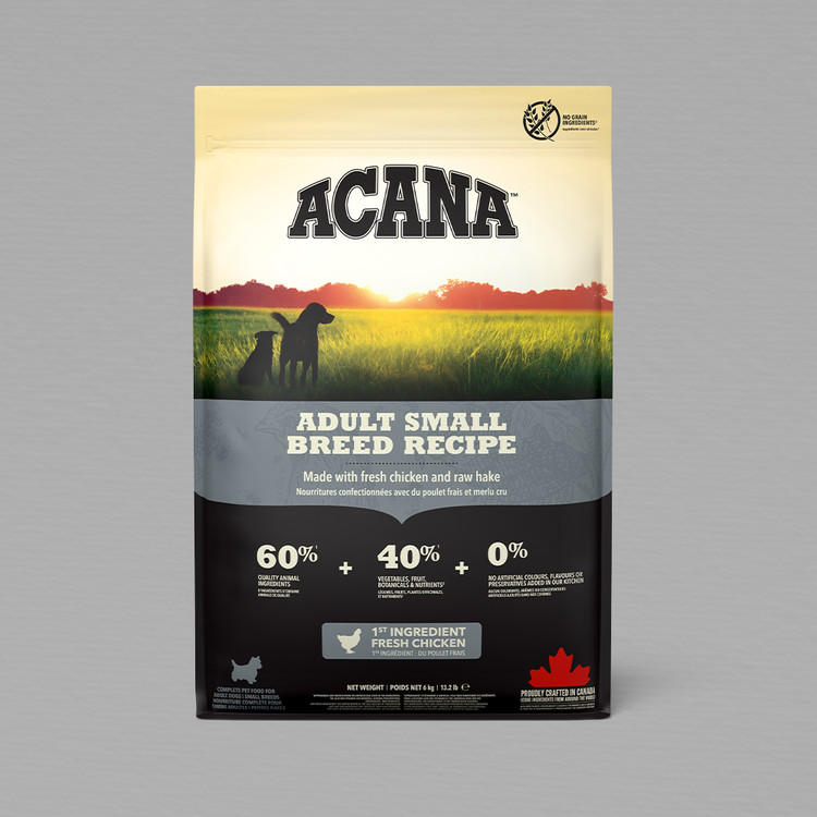 ACANA ADULT SMALL BREED는 놓아 기른 닭, 자연산 가자미, 신선한 자연란의 살코기, 장기, 연골과 뼈를 통먹이 비율로 들어있어 영영분과 풍미가 가득합니다.