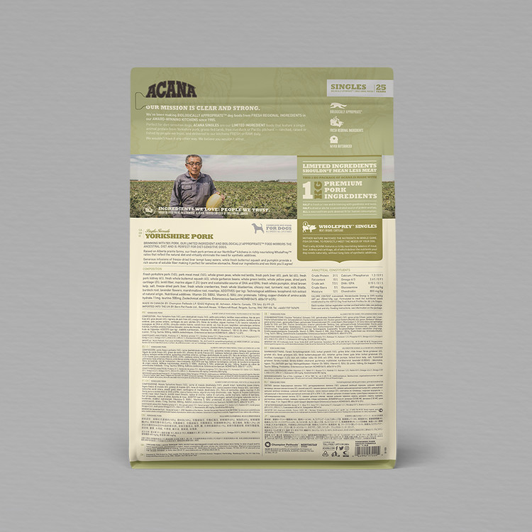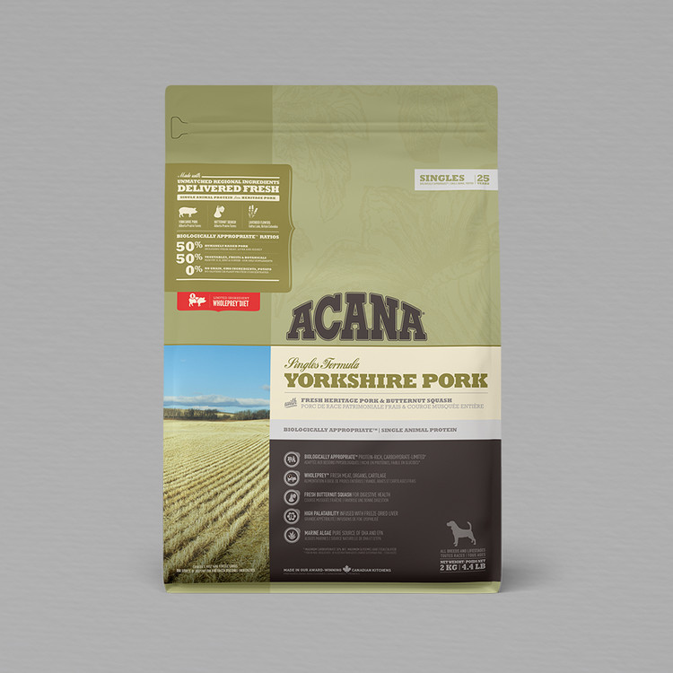 ACANA Singles Yorkshire Pork에는 육류, 내장 및 연골의 WholePrey 비율로 50 % 품질의 돼지 고기 재료가 들어 있고, 통째로 맛있는 버터 넛 스쿼시를 보완하여 개에게 행복을 유지하는 데 필요한 단백질, 영양소 및 섬유질을 제공합니다. 건강하고 강합니다.