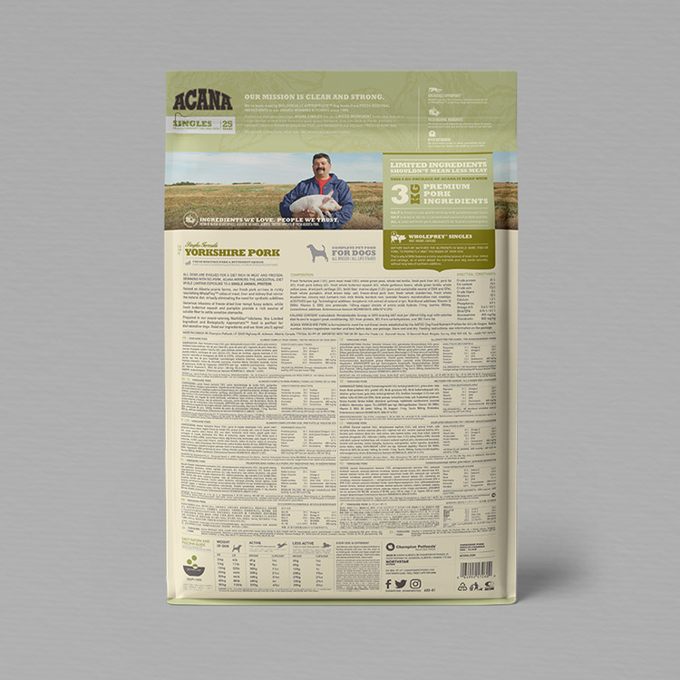 ACANA Singles Yorkshire Pork에는 육류, 내장 및 연골의 WholePrey 비율로 50 % 품질의 돼지 고기 재료가 들어 있고, 통째로 맛있는 버터 넛 스쿼시를 보완하여 개에게 행복을 유지하는 데 필요한 단백질, 영양소 및 섬유질을 제공합니다. 건강하고 강합니다.