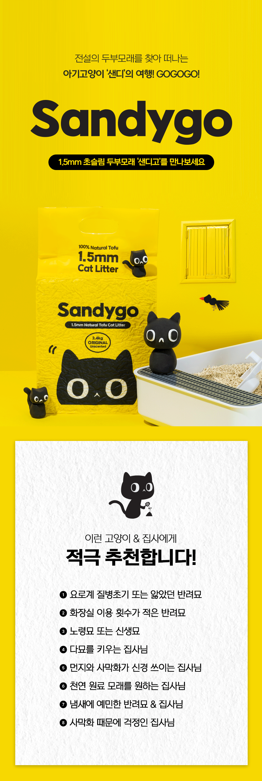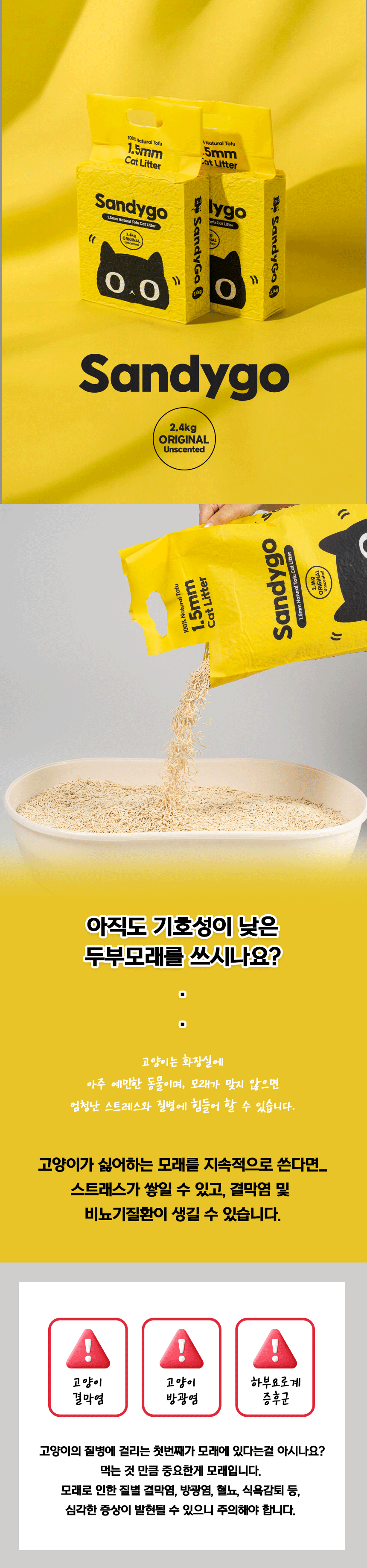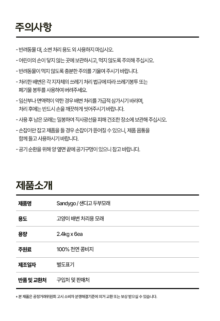 샌디고 고양이 두부모래 1.5mm 초슬림입자 무향 2.4kg x 6개