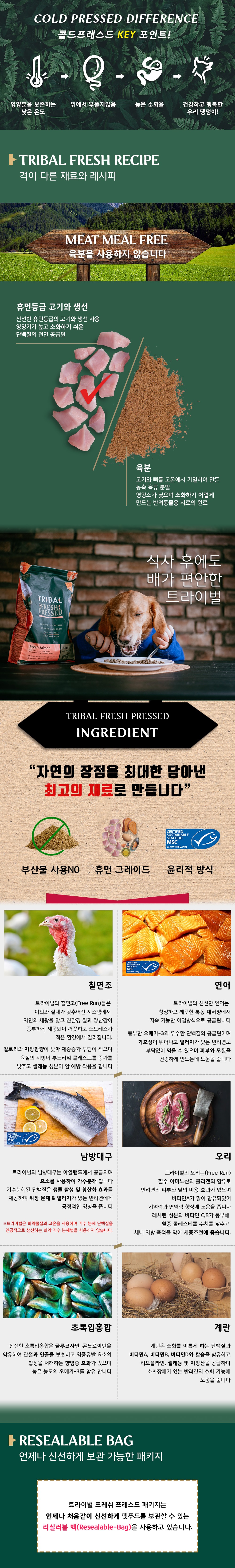 트라이벌은 자유방목한 육류 등의 신선한 휴먼 그레이드 재료와 저온 압착 방식인 콜드 프레스드 기술로 조리한 건강한 사료입니다.