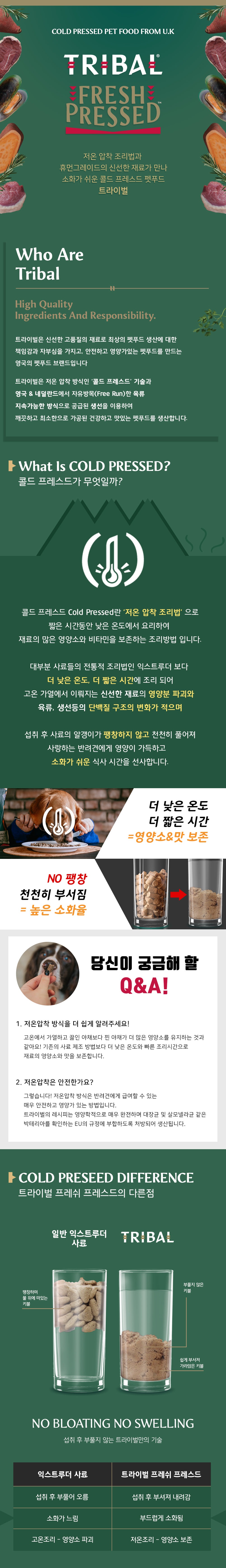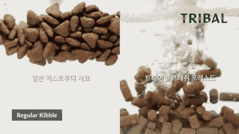 일반 익스트루더 사료들은 섭취 시 알갱이가 위에서 팽창하지만, 트라이벌 사료는 서서히 부서져 소화 흡수가 빠르다고 합니다.
