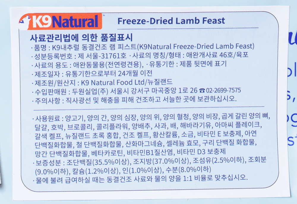 [1+1] K9 동결건조 사료 양고기 142g (유통기한 26.04.14)